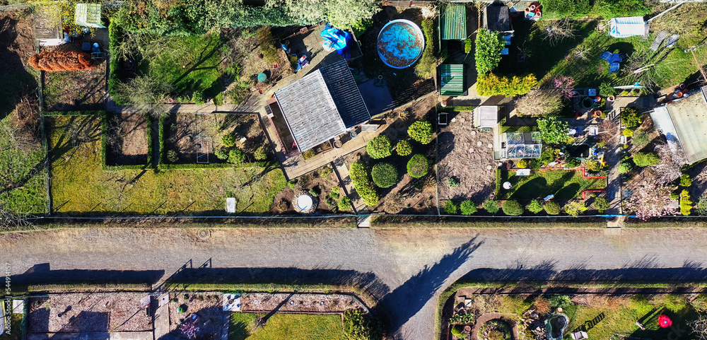 Fototapeta Abstract vertical aerial view of garden arbor in allotment garden behind dead st