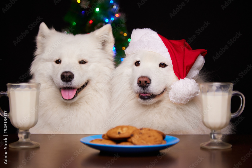 Fototapeta Two adorable dogs in a red Santa Claus hat are sitting at a table against the background of a Christmas tree with milk and delicious cookies