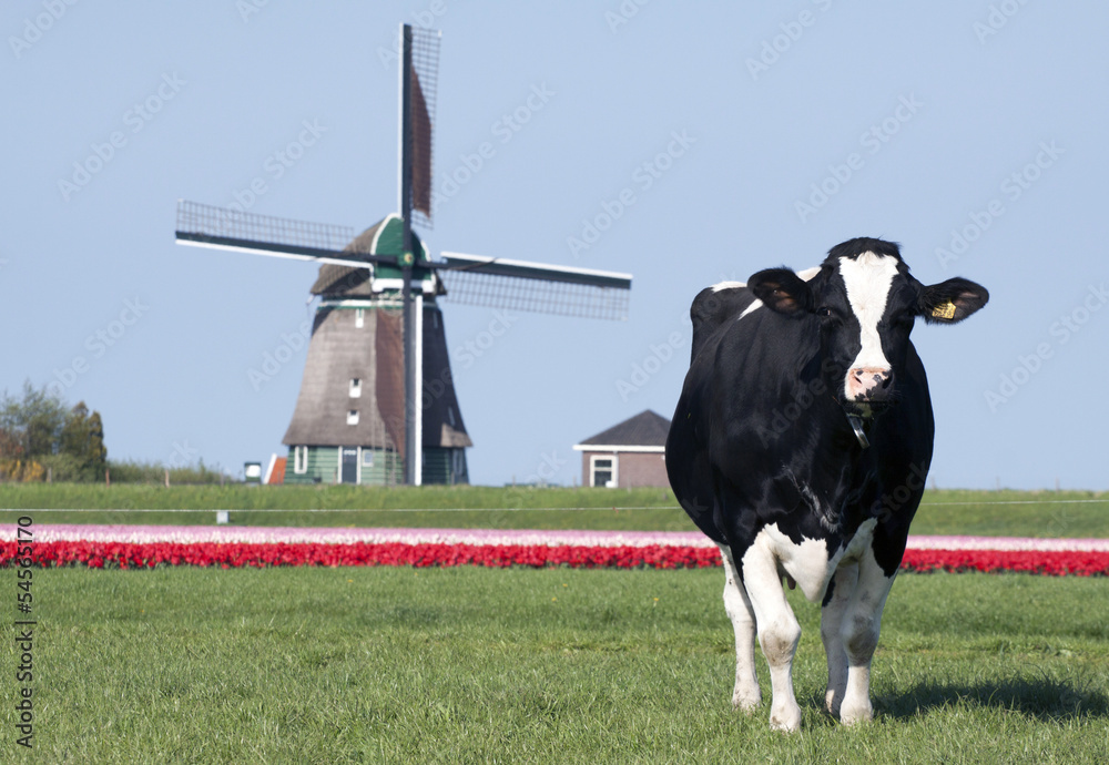 Fototapeta Picture of a cow with tulips and windmill in the background