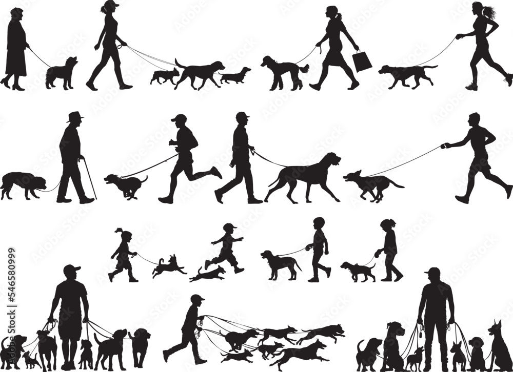 Fototapeta Men, women and children walk or run with the dog people vector silhouette collec