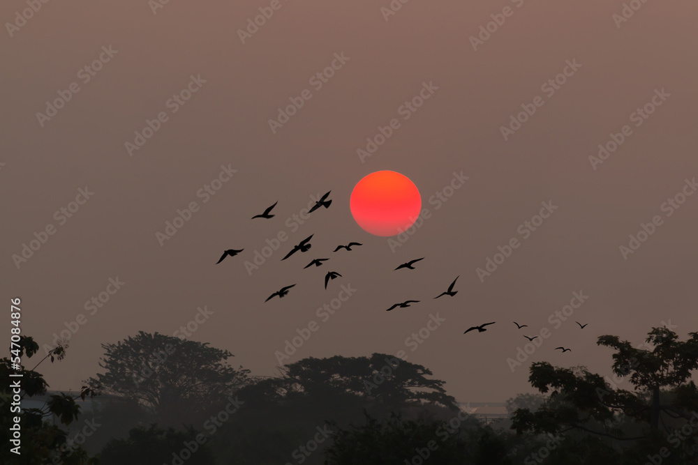 Fototapeta Amazing silhouette of flying birds above tree plants at sunset