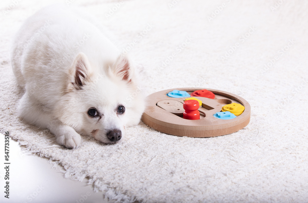 Fototapeta Smart dog is looking for delicious dried treats in intellectual game and eating them, close up