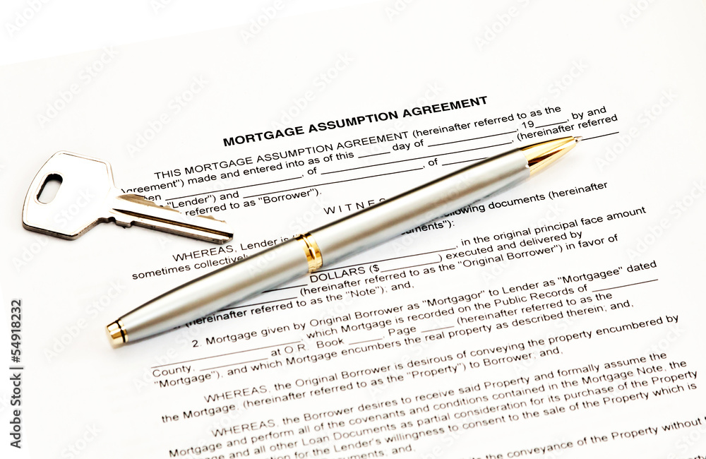 Fototapeta Mortgage assumption agreement with a pen for signature and a key