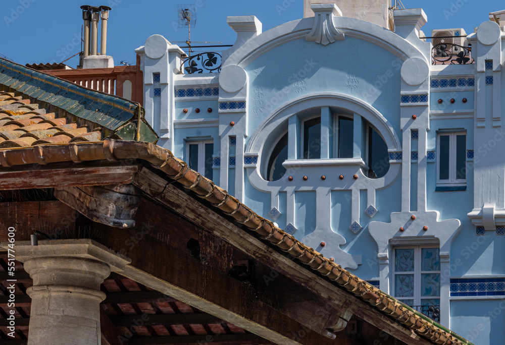 Fototapeta Interior and exterior tiled roof of la porxada monument and behind modernist bui