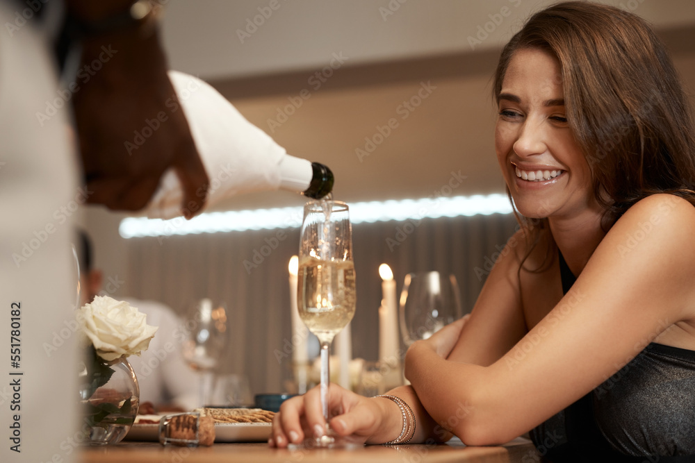 Fototapeta Happy woman, champagne glass and restaurant with a waiter pouring alcohol for a celebration, birthday or new years event