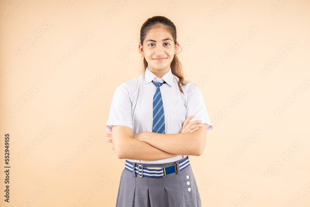 Fototapeta Happy confident Indian student schoolgirl wearing school uniform standing cross arm isolated over beige background, Studio shot, closeup, Education concept