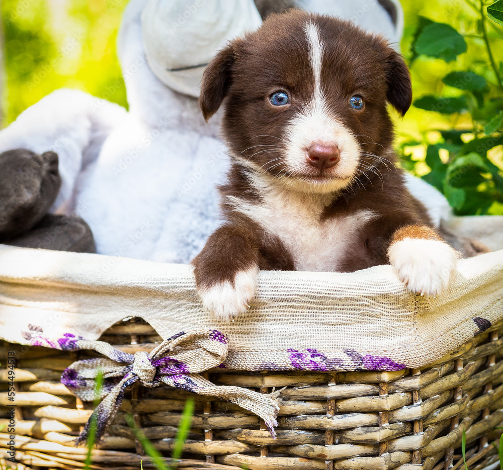 Fototapeta A beautiful puppy sits in a basket with toys in the park in the green grass