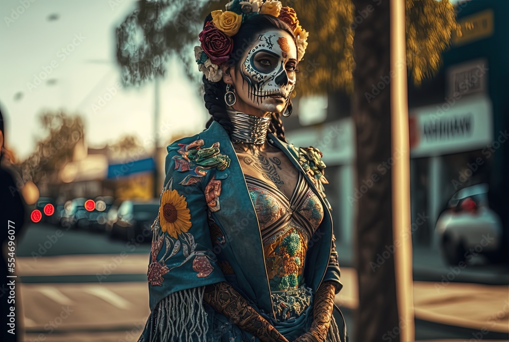 Fototapeta illustration of a woman wear make up and dress in skull , Day of the Dead or Día