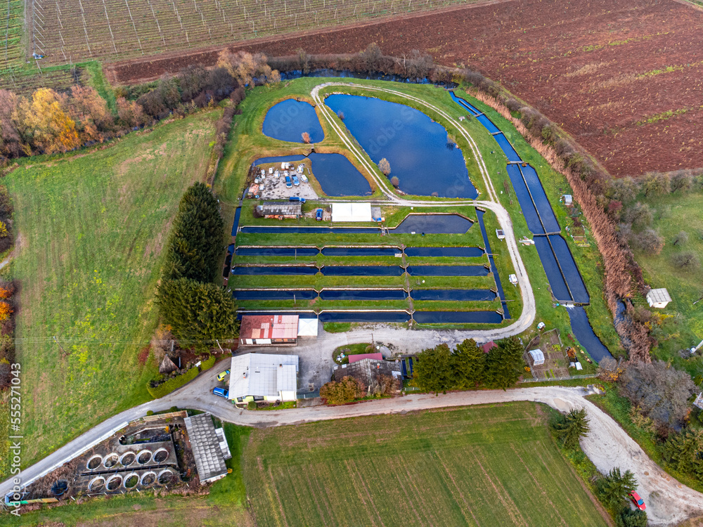 Fototapeta Aquaculture ponds and used for fish farming top down