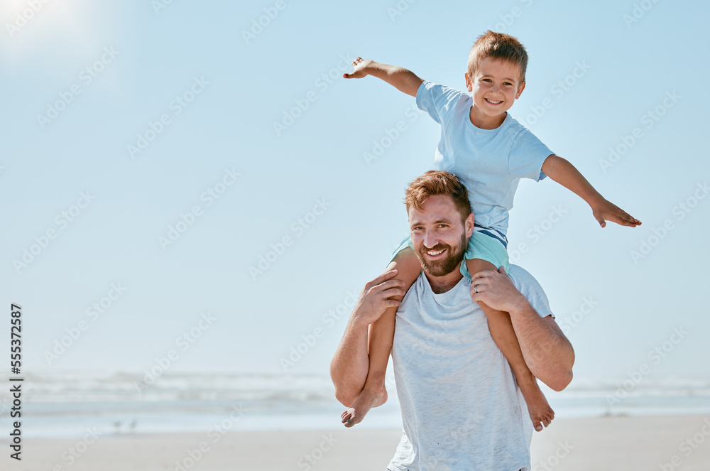 Fototapeta Father, kid and piggy back at beach on vacation, holiday or trip mock up