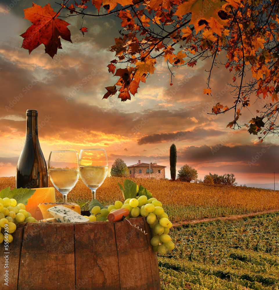 Fototapeta White wine with barell in vineyard, Chianti, Tuscany, Italy
