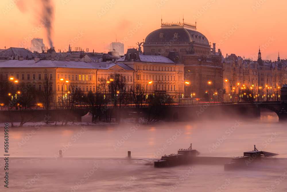 Fototapeta A misty dawn in the winter morning over Vltava river and national theatre in Prague
