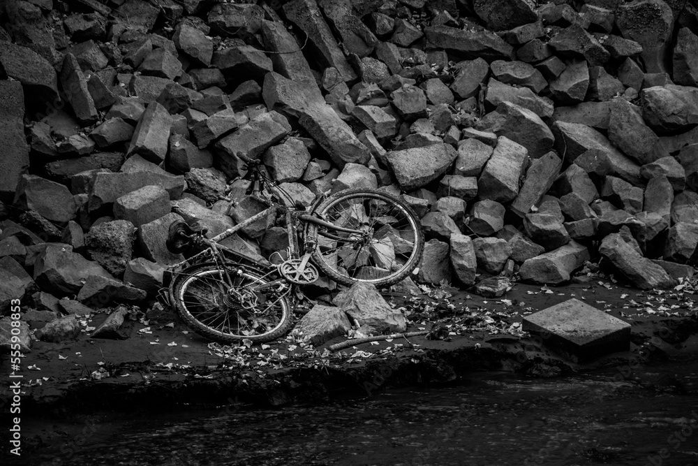 Fototapeta Schrott Fahrrad am Wrack des Aalschokkers Conny am Silbersee in Dormagen