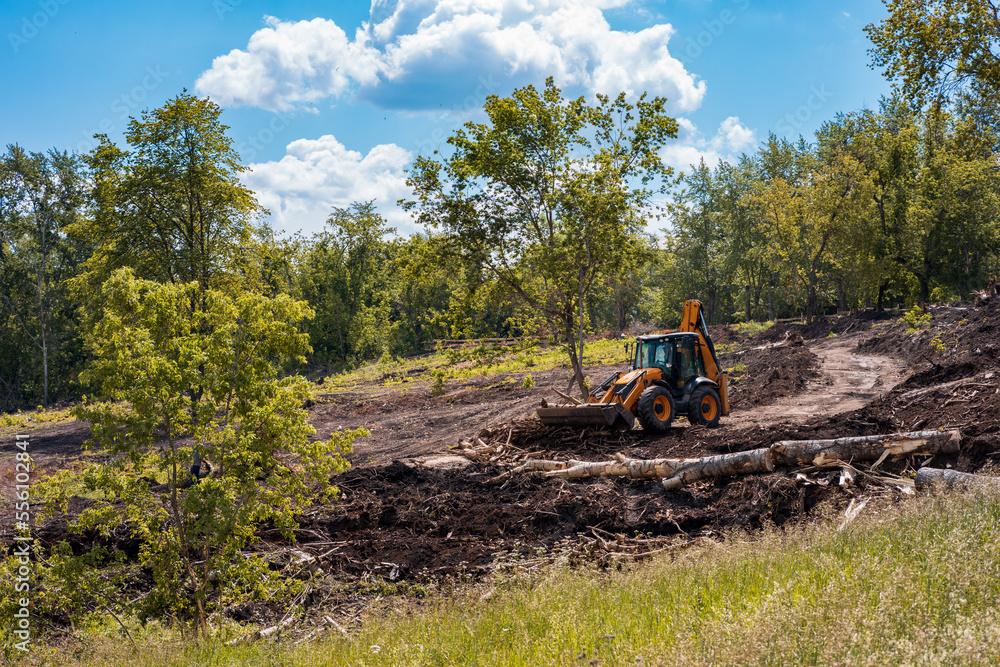 Fototapeta a tractor with a bucket rows branches and cleans the park