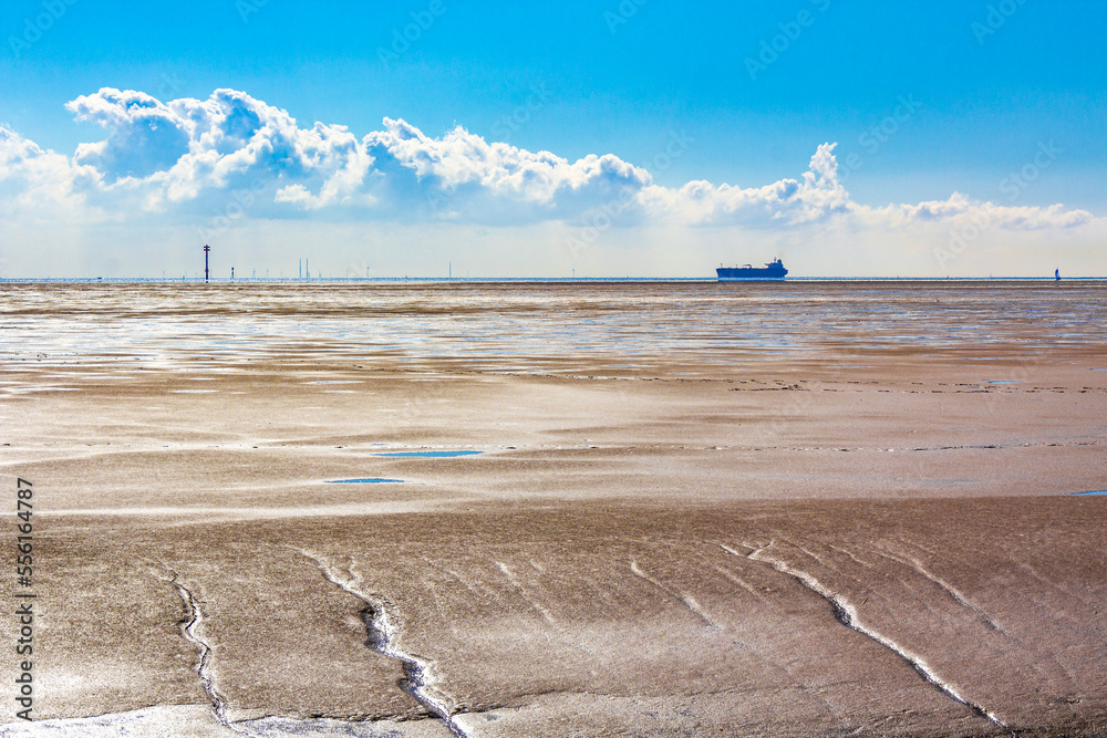 Fototapeta Hiking in mudflats mud on the dike and sea Germany.