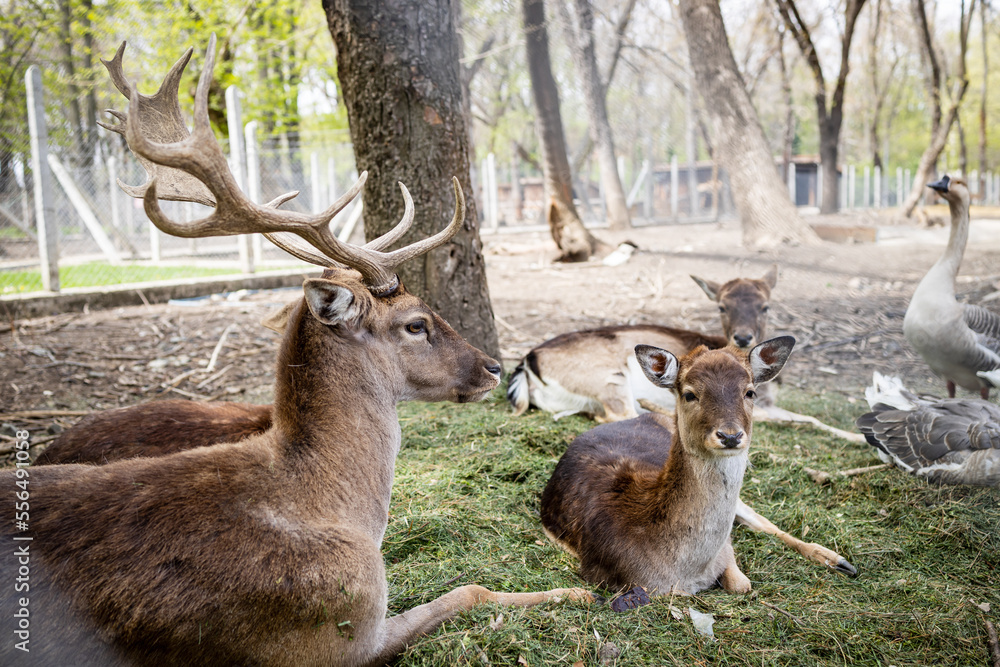 Fototapeta Lying deer and roe deer in the forest. Close up.