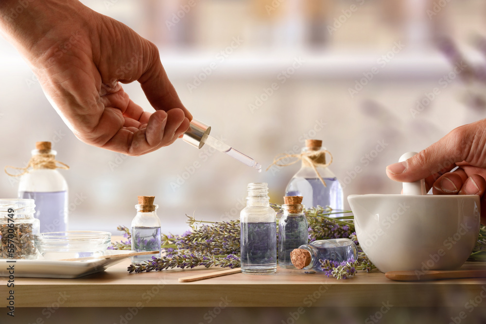 Fototapeta Person making homemade lavender essence with tools on wooden bench