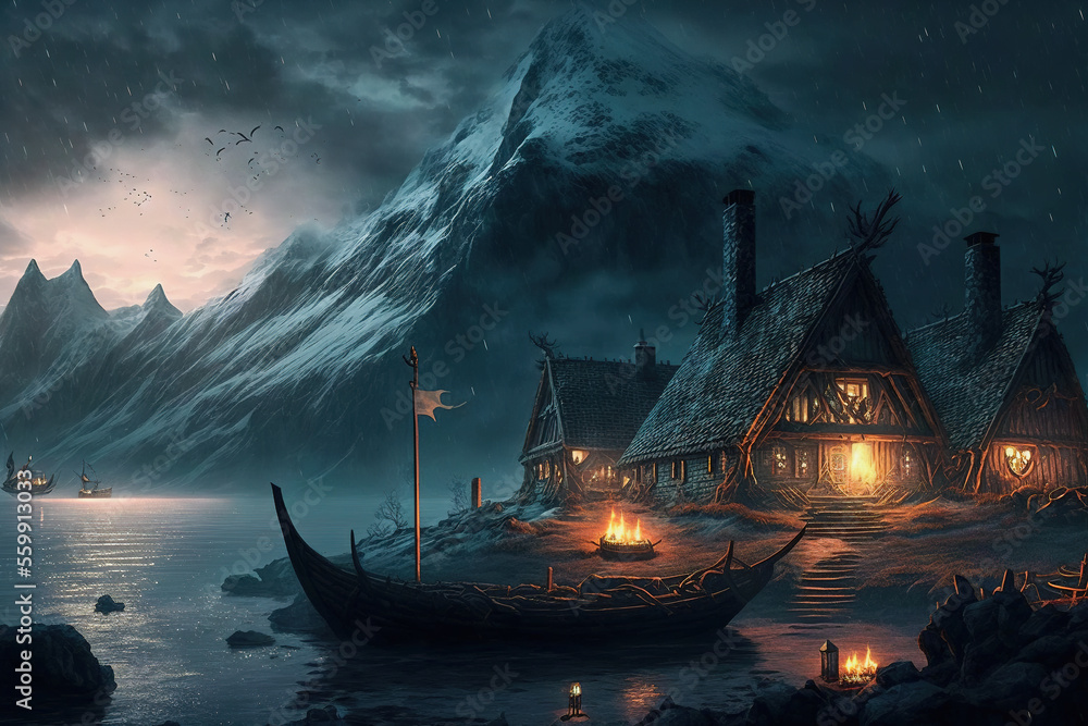 Fototapeta ai generative midjourney illustration of a viking village in a viking landscape