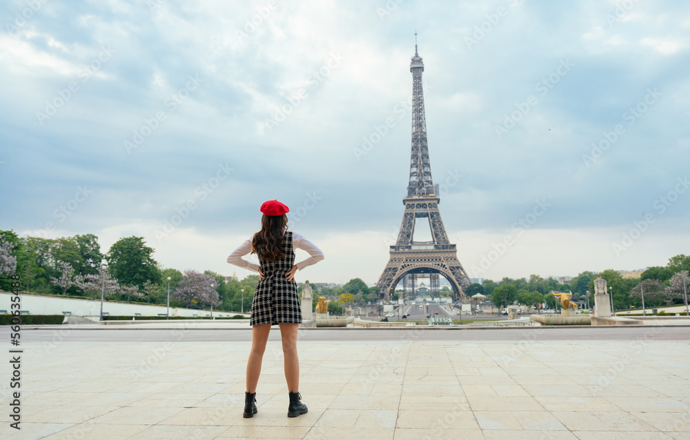 Fototapeta Beautiful young woman visiting paris and the eiffel tower