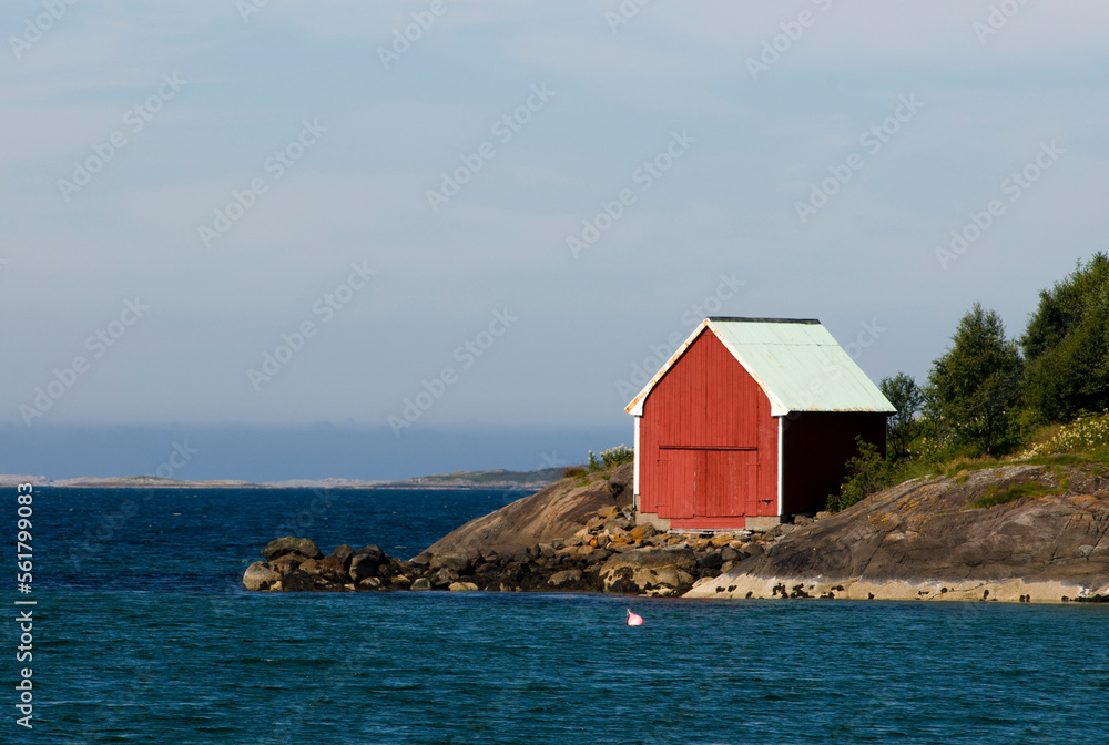 Fototapeta single red boathouse with sun and sea, near ulsteinvik, Western Norway