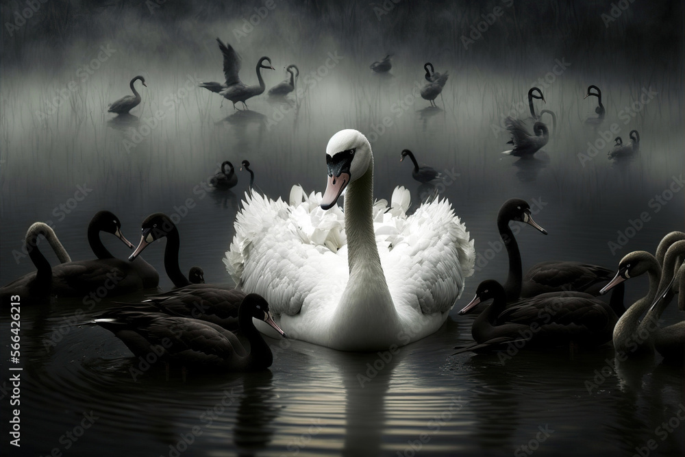Fototapeta Illustration of a white swan with black ones, concept of individuality and special personalities