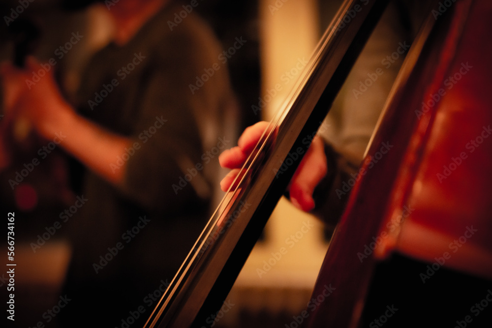 Fototapeta Jazz musician playing acoustic bass in house live music show