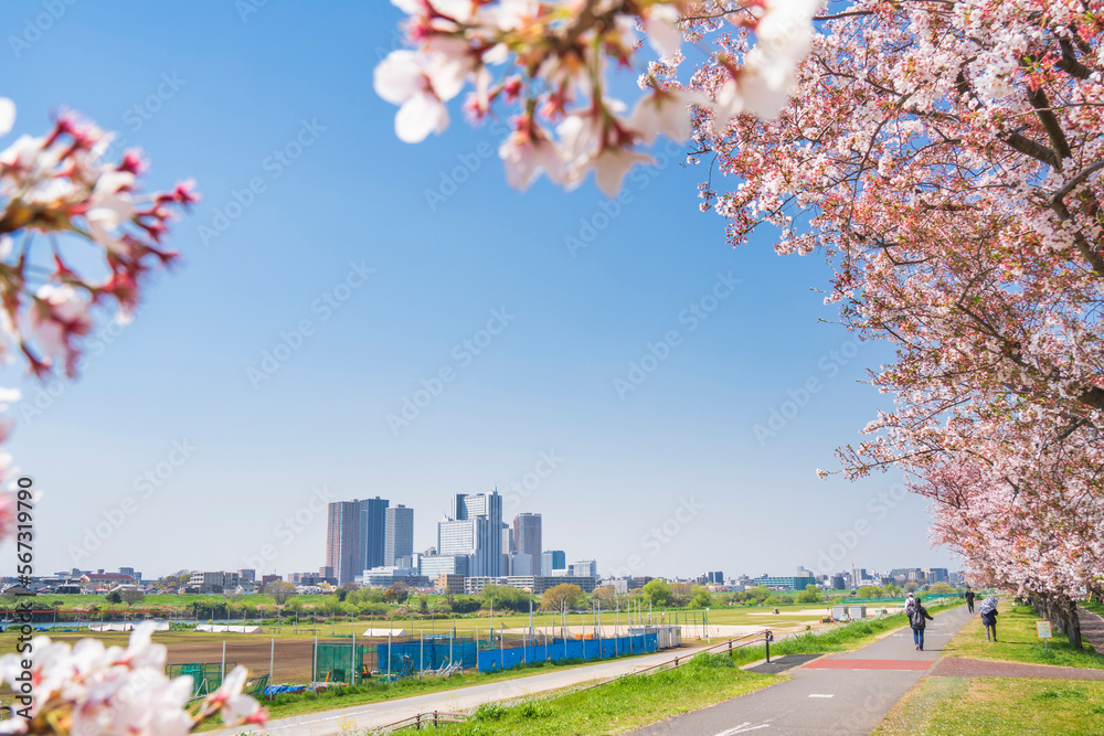 Fototapeta 多摩川の桜並木と武蔵小杉のタワーマンション群【神奈川県・川崎市】  Cherry blossom and Musashi-Kosugi tower condom
