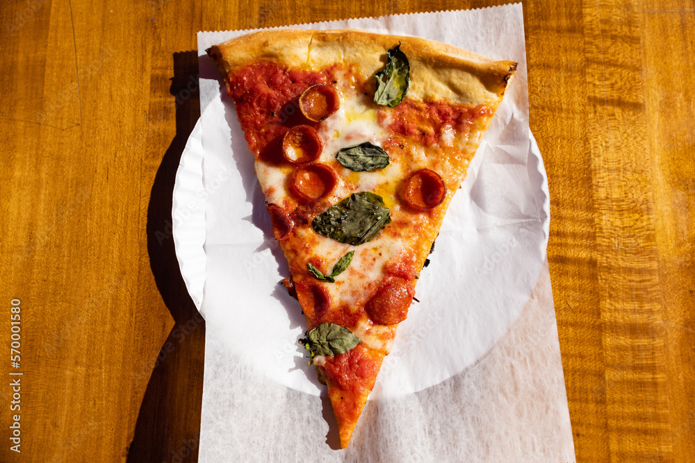 Fototapeta New York City Style Pepperoni Pizza Slice with Fresh Basil on a White Paper Plat