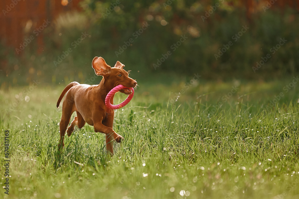 Fototapeta Two brown young dogs of the Hungarian Vizsla breed are playing in the meadow on a summer day