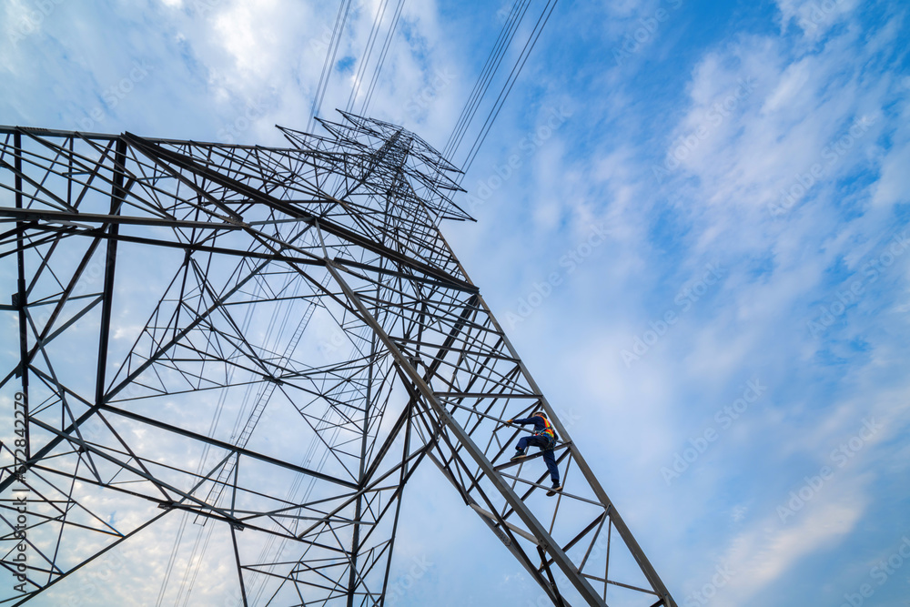 Fototapeta Workers wearing safety harnesses are working at high voltage pylons for inspection and maintenance at high voltage pylon stations