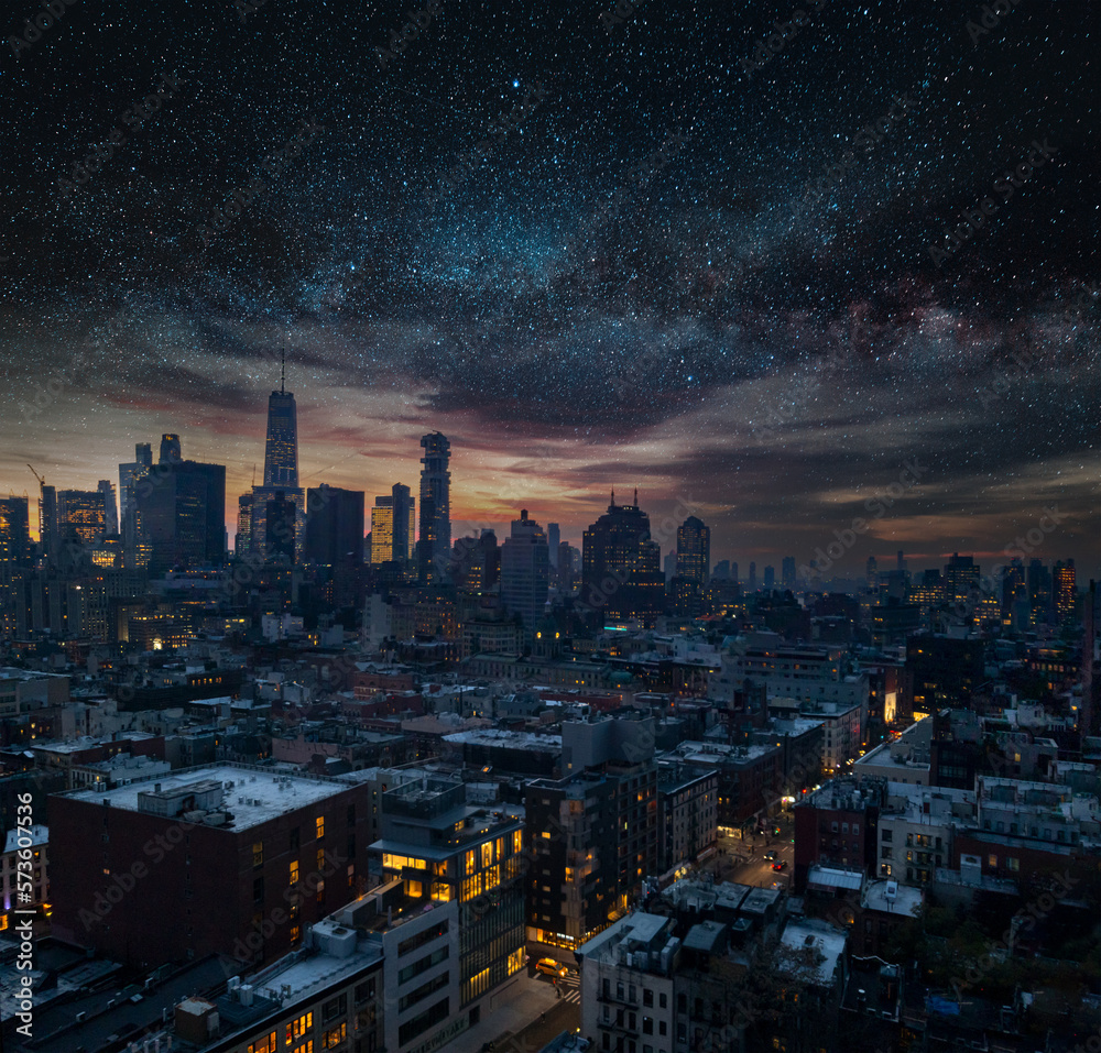 Fototapeta Starry night time sky above the downtown skyline buildings of Manhattan in New Y