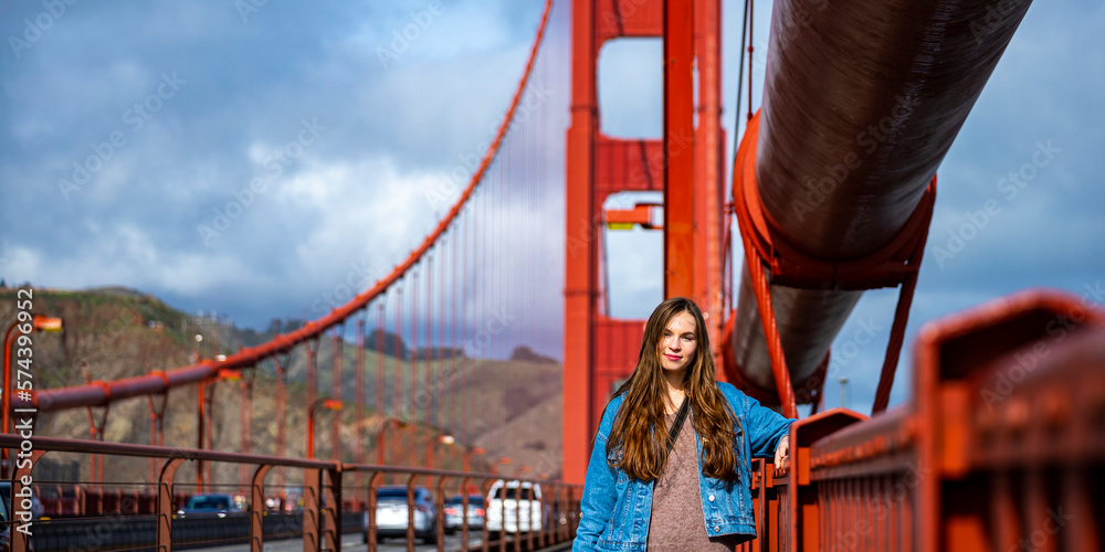 Fototapeta a beautiful long-haired model in a denim jacket stands on the famous golden gate