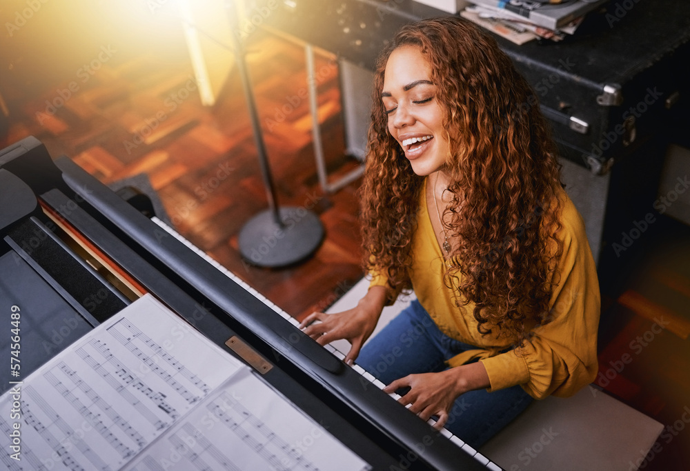 Fototapeta Musician, piano or singing woman in studio album recording, night performance or theatre practice for jazz label industry