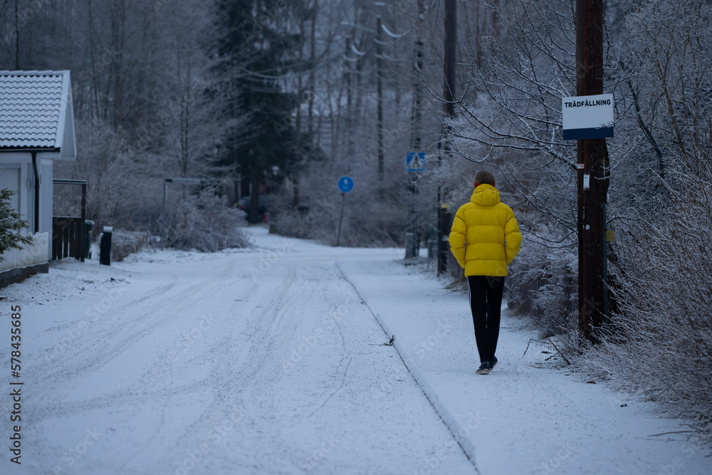 Fototapeta person walking in snow, nacka,sweden, sverige, stockholm