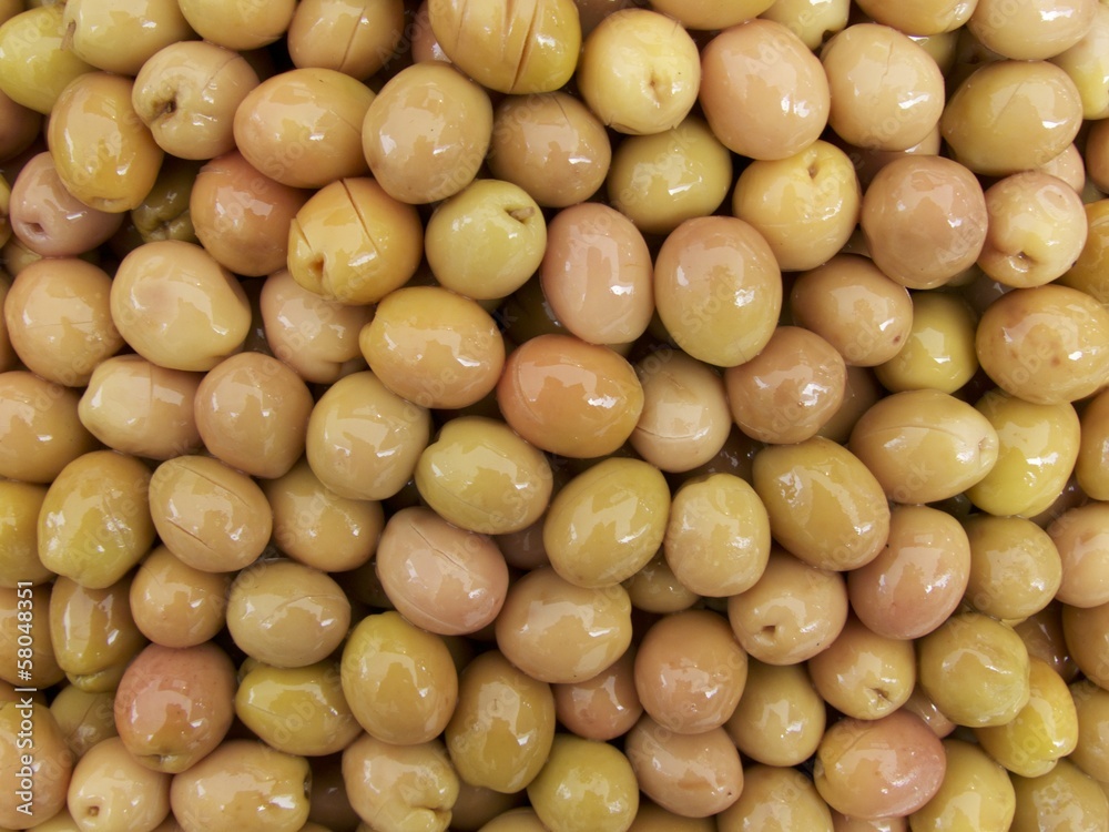 Fototapeta Eingelegte grüne Oliven ohne Kern auf einem Wochenmarkt und Basar im Stadtteil E