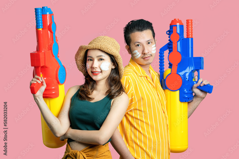 Fototapeta Happy Asian couple playing in the water for Songkran