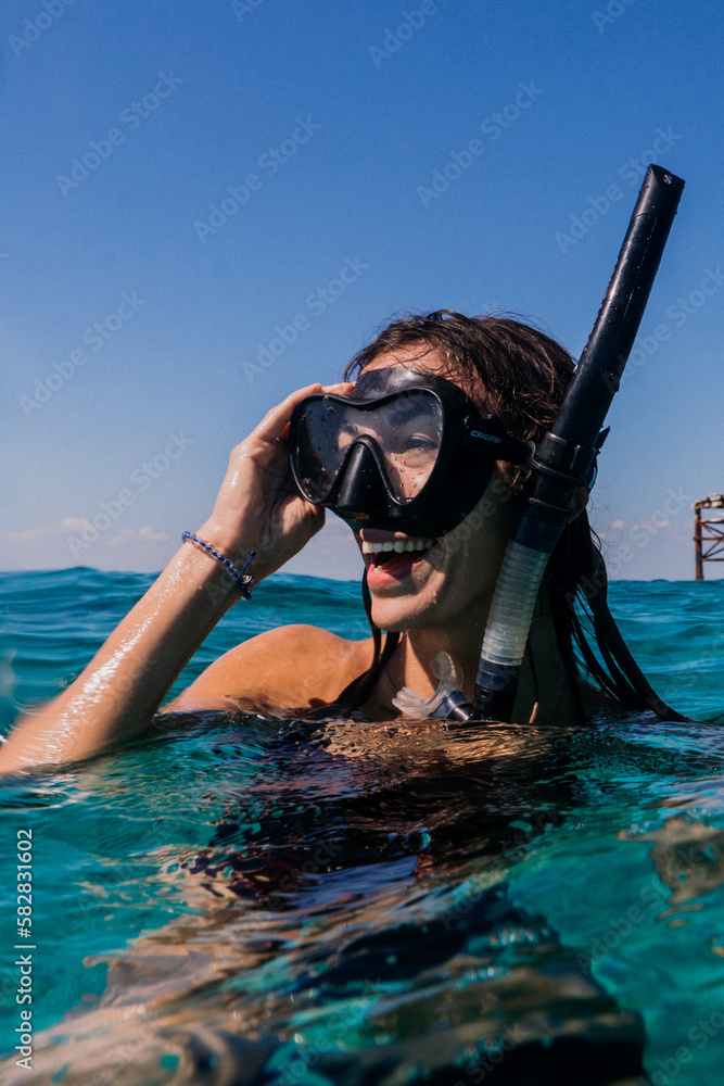 Fototapeta Joyful, carefree woman, snorkeling and swimming on beach vacation, having fun in