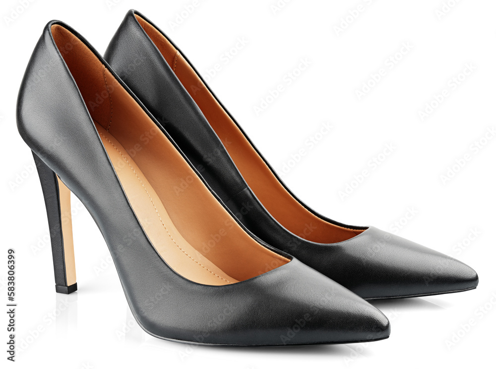 Fototapeta Black leather high heeled women shoes or Stilettos isolated on transparent background
