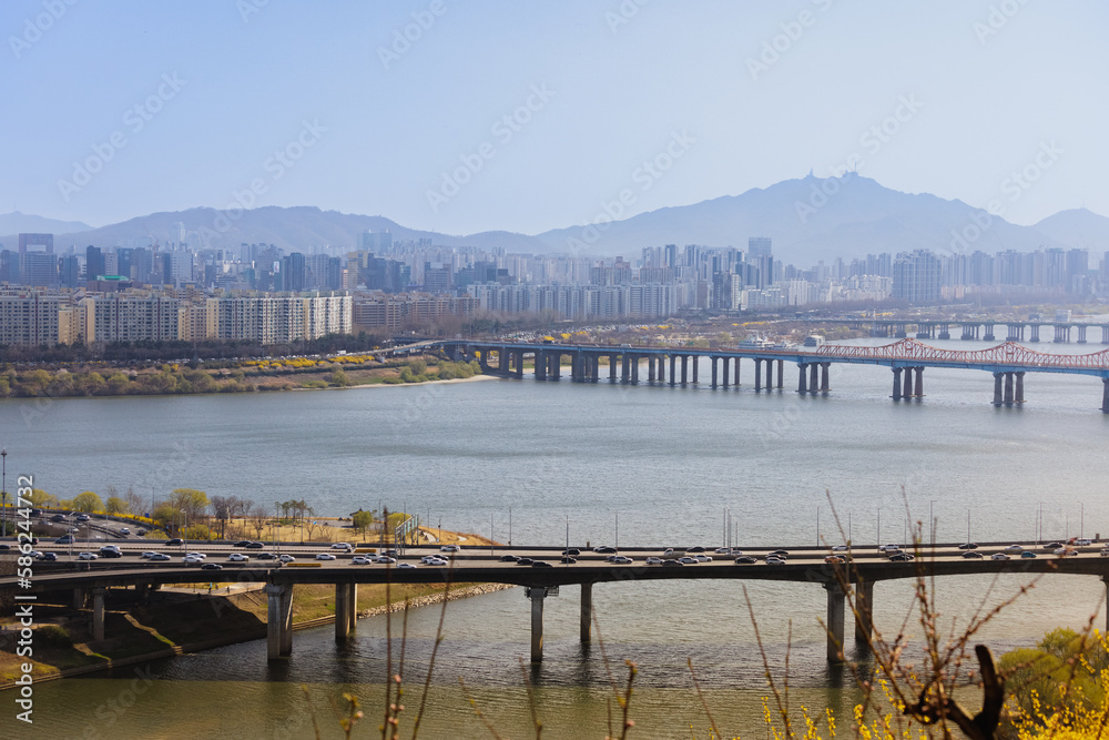 Fototapeta Seoul Han river scenery in spring, forsythia, many bridges, traffic jam, skyline