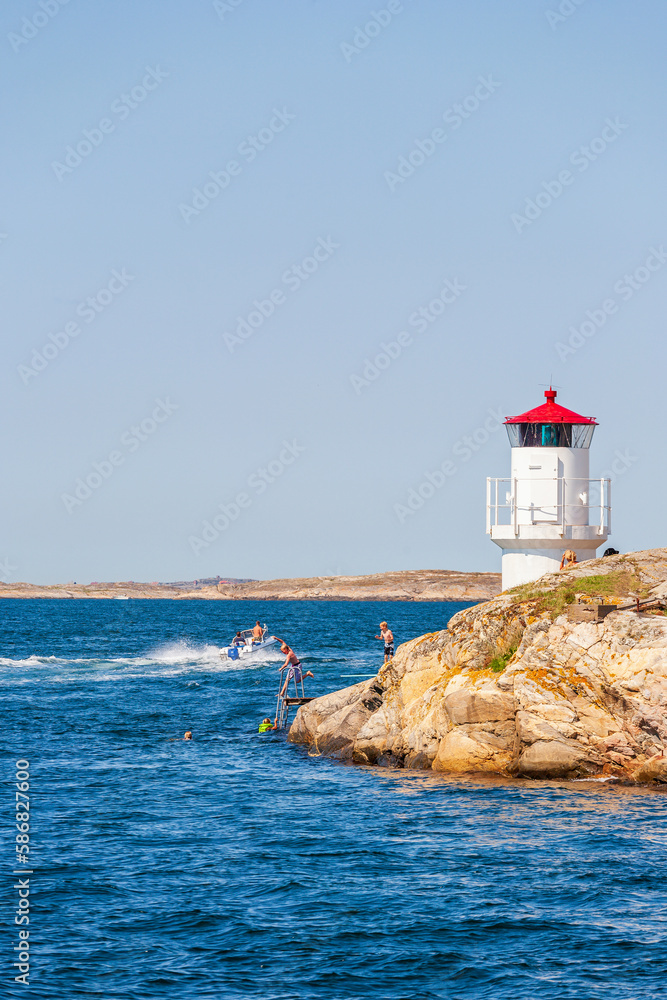 Fototapeta Children bathing in the sea by a cliff with a lighthouse