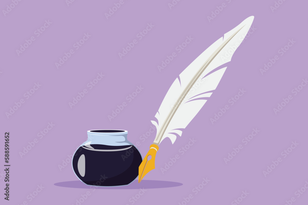 Fototapeta Character flat drawing antique feather quill pen with ink bottle logo, label, icon, symbol