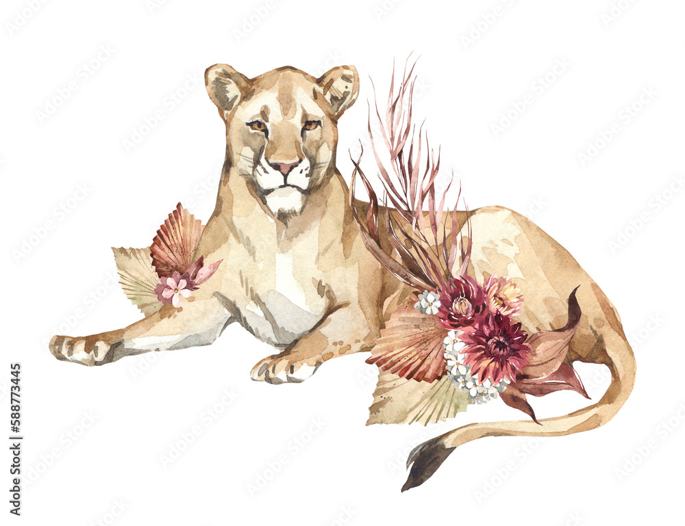 Fototapeta Watercolor lioness with boho flowers