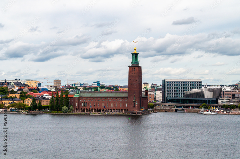 Fototapeta Stockholm, Sweden - The embankment with the brick building of the town hall with an observation tower and modern houses in the vicinity