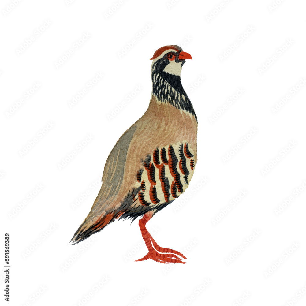 Fototapeta Hand drawn watercolor drawing of Red-legged partridge (Alectoris rufa) on a whit
