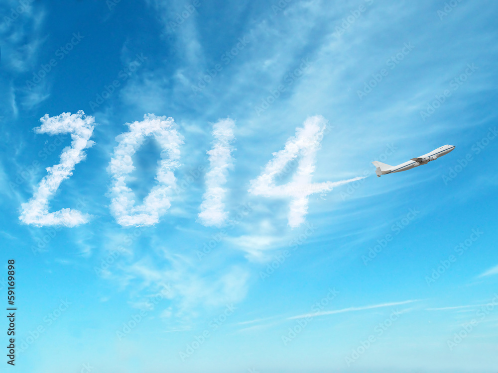 Fototapeta 2014 with airplane on clouds sky