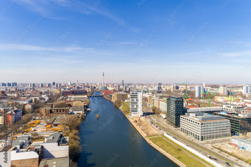 Fototapeta Aerial view of Spree river, Friedrichshain, Berlin, Germany