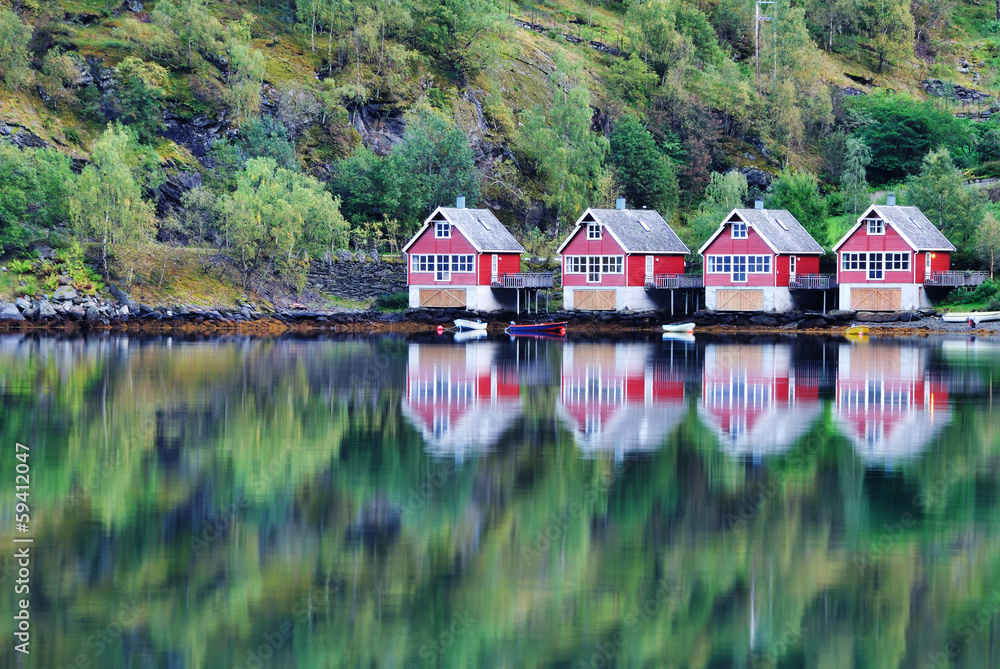 Fototapeta Scenic View of lake and fishing huts in Flam, Norway