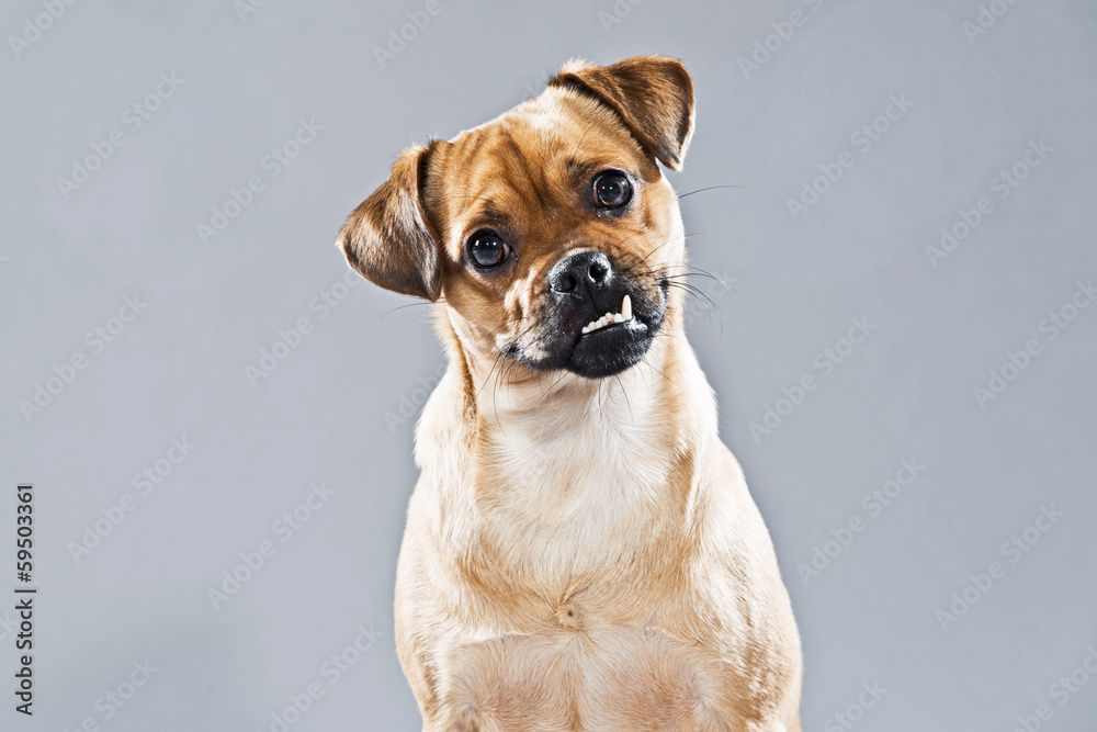 Fototapeta Mixed breed dog pug and lhasa apso. Studio shot against grey.