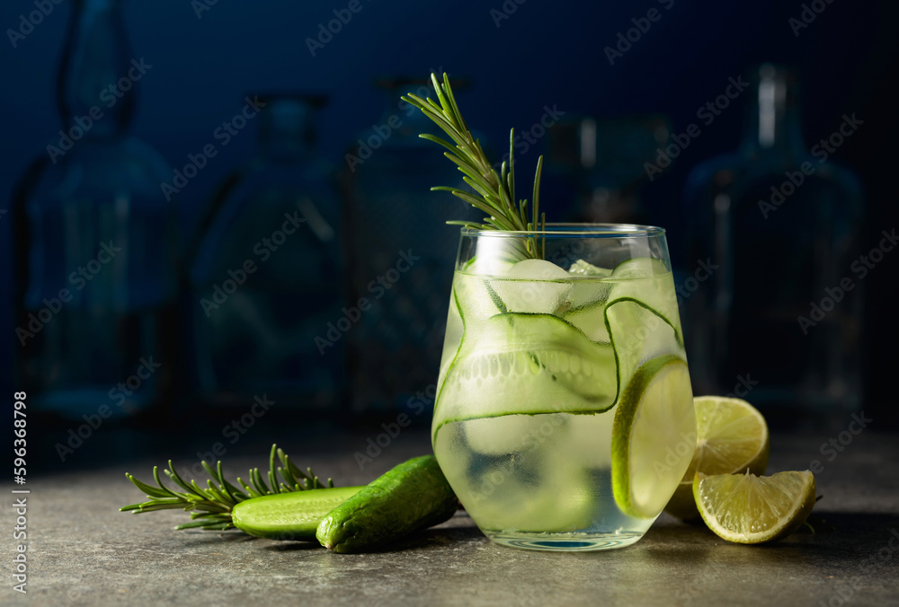 Fototapeta Cocktail gin tonic with ice, rosemary, lime, and cucumber.