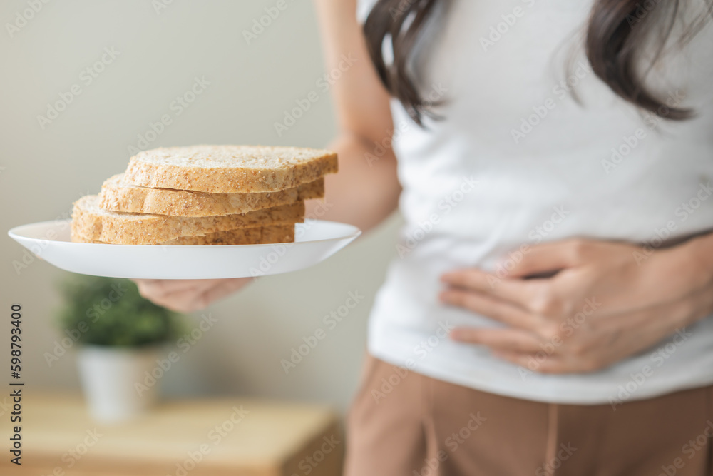 Fototapeta Gluten allergy, asian young woman hand holding, refusing to eat white bread slice on plate in breakfast food meal at home, girl having a stomach ache